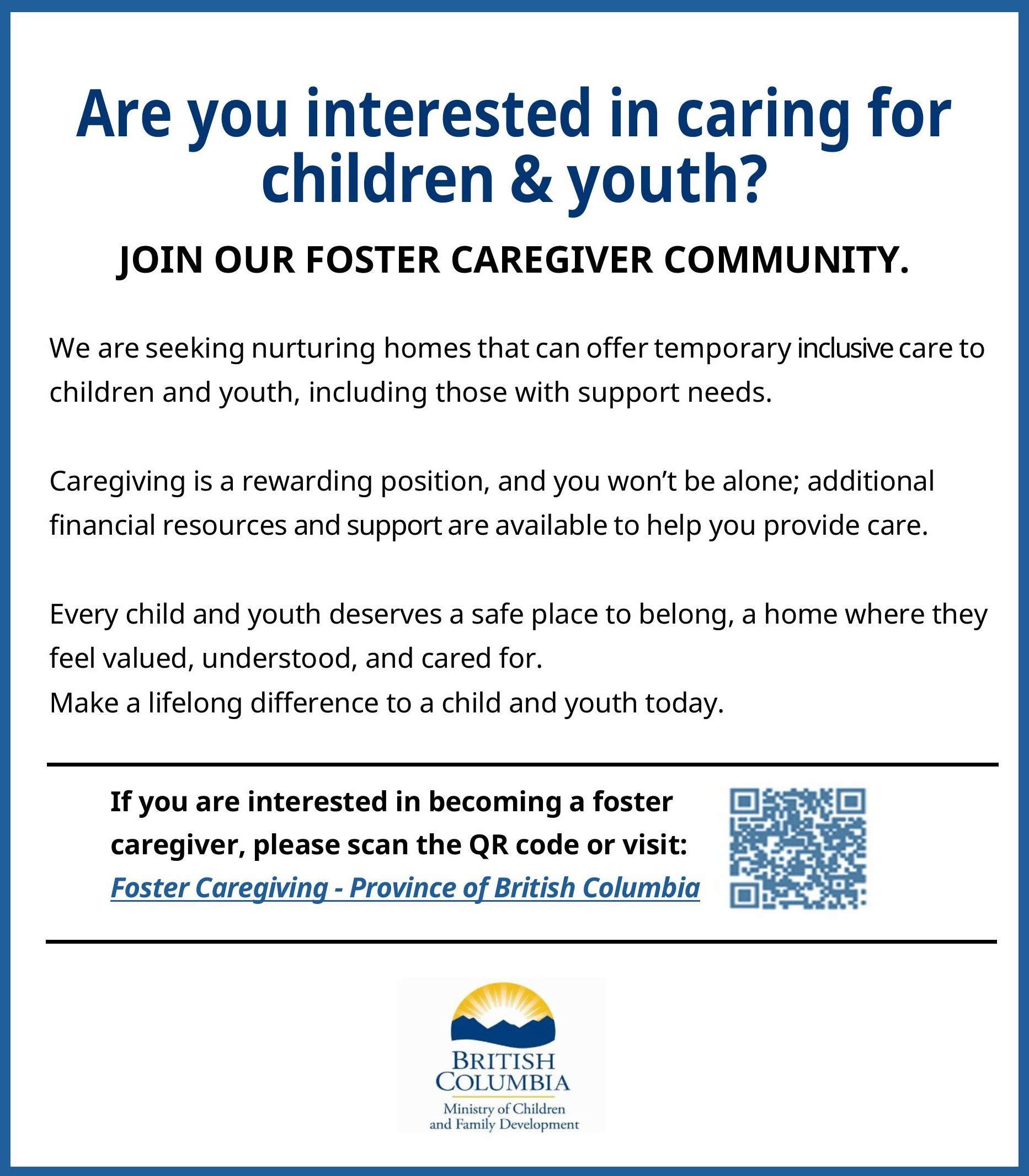 - The Ministry of Child & Family Development is looking for Foster Caregivers. Please see the attachment for more information.